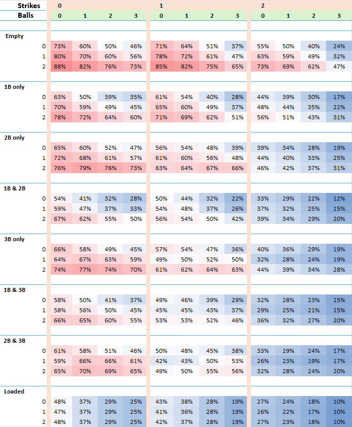 On the flip side is a bases empty, 2 outs, first-pitch call: in order to challenge that, the breakeven point is 88%. That means it has to be an egregiously obvious call in order to challenge. Even if you think you are pretty sure it was the wrong call, the player will not challenge it. Being 75% sure is not good enough. Even 80 or 85% is not good enough. You need to be 90% sure it was a bad call. That's because the difference between a 1-0 count (with bases empty, 2 outs) and an 0-1 count is the difference between 0.12 runs and 0.09 runs. With a difference of 0.03 runs, compared to our baseline of 0.20 runs, that's a ratio of 0.15 to 1. The odds are overwhelmingly against a challenge unless it's a sure thing.
